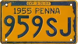 1955–56 Embossed navy blue on golden yellow with state-shaped border; "1955 PENNA" at top; "EXP. 3-31-56" inside top border 12345