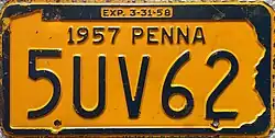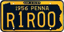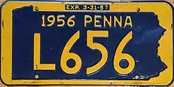 1956–57 Embossed golden yellow on navy blue with state-shaped border; "1956 PENNA" at top; "EXP. 3-31-57" inside top border 12345