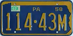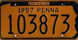 1957–58 Embossed navy blue on golden yellow with state-shaped border; "1957 PENNA" at top; "EXP. 3-31-58" inside top border 12345
