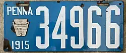 1915 White on medium blue porcelain; "PENNA", aluminum keystone and "1915" at left 123456 1 to 19999;