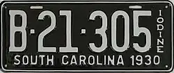 1930 Embossed white serial on black plate with border line; "SOUTH CAROLINA 1930" at bottom Vertical "IODINE" at right A-12-345 Letter corresponds to weight class The slogan referred to the high amounts of iodine found in South Carolina's produce. Similar slogans were used through 1933.