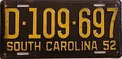 1952 Embossed yellow serial on black plate; "SOUTH CAROLINA 52" at bottom none A·123·456 Letter corresponds to weight class