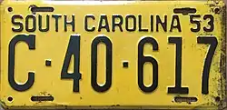 1953 Embossed black serial on golden yellow plate; "SOUTH CAROLINA 53" at top none A·123·456 Letter corresponds to weight class