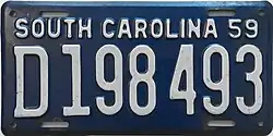 1959 Embossed white serial on blue plate; "SOUTH CAROLINA 59" at top none A-123456 Letter corresponds to weight class