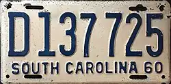 1960 Embossed blue serial on white plate; "SOUTH CAROLINA 60" at bottom none A-123456 Letter corresponds to weight class