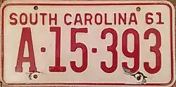 1961 Embossed red serial on white plate with border line; "SOUTH CAROLINA 61" at top none A-123456 Letter corresponds to weight class