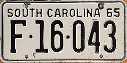 1965 Embossed black serial on white plate with border line; "SOUTH CAROLINA 65" at top none A-123456