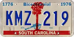 1976 – December 1979 Embossed blue serial on reflective white plate; red Sabal palmetto and blue cannon screened in the center; "1775" and "1783" screened in blue on either side of cannon; red band screened at bottom containing "SOUTH CAROLINA" in white in the center "1776 Bicentennial 1976" screened in blue at top ABC 123 AAA 101 to WZZ 400; AAA 401 to WZZ 500 Commemorated both the US Bicentennial and the Revolutionary War. Numbers 101–400 issued for each three-letter series first, followed by 401–500 from 1978.