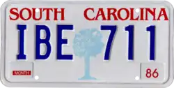 January 1985 – December 1989 Embossed blue serial on reflective white plate; pale blue Sabal palmetto screened in the center; "SOUTH CAROLINA" screened in red at top none ABC 123 AAA 501 to ZZZ 999 Numbers 501–900 issued for each three-letter series, with 901–999 added in 1988.