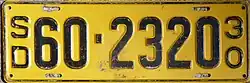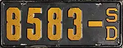 1932 Embossed yellow on black with border line; vertical "SD" and "32" at left and right respectively none 1-1234