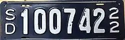 1922 Embossed white on dark blue; lines at top and bottom borders; vertical "SD" and "22" at left and right respectively none 123456 30000 to approximately 150000