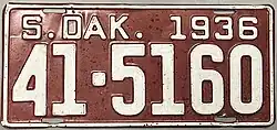 1936 Embossed white on brick red with border line; "S. DAK. 1936" at top none 1-1234