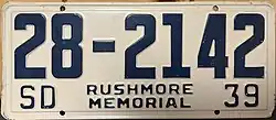 1939 Embossed blue on white; "SD" at bottom left and "39" at bottom right "RUSHMORE MEMORIAL" at bottom center 1-1234