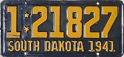 1941 Embossed golden yellow on black; "SOUTH DAKOTA 1941" at bottom none 1-1234