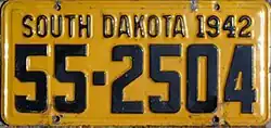 1942–44 Embossed black on golden yellow; "SOUTH DAKOTA 1942" at top none 1-1234