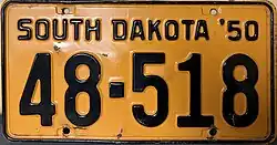 1950 Embossed black on orange with border line; "SOUTH DAKOTA '50" at top none 1-1234