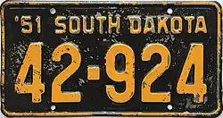 1951 Embossed orange on black with border line; "'51 SOUTH DAKOTA" at top none 1-1234
