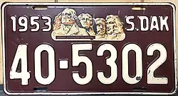 1953 Embossed beige on maroon with border line; "1953", Mount Rushmore decal and "S.DAK" at top none 1-1234