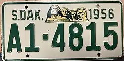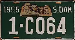 1955 Embossed white on green with border line; "1955", Mount Rushmore decal and "S.DAK" at top none 1-1234