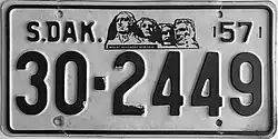 1957–59 Embossed black on reflective white with border line; "S.DAK.", stamped Mount Rushmore graphic and "57" at top none 1-12345