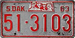 1963 Embossed red on reflective white with border line; "S.DAK.", stamped Mount Rushmore graphic and "63" at top none 1-12345