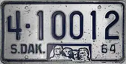 1964 Embossed dark blue on reflective white with border line; "S.DAK.", stamped Mount Rushmore graphic and "64" at bottom none 1-12345