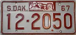 1967 Embossed maroon on reflective white with border line; "S.DAK.", stamped Mount Rushmore graphic and "67" at top none 1-12345
