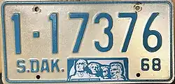 1968 Embossed light blue on reflective white with border line; "S.DAK.", stamped Mount Rushmore graphic and "68" at bottom none 1-12345