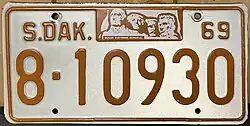 1969 Embossed orange on reflective white with border line; "S.DAK.", stamped Mount Rushmore graphic and "69" at top none 1-12345