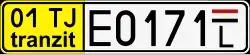 Reminiscent of modern Russian transit numbers, but mirrored. On the left, in a separate window, information is applied in black on yellow in 2 rows: the top row is the registration region code and the combination “ TJ ”, the bottom row is the word “ tranzit ”. In the rest of the letter, four numbers and one more letter are applied in black and white. Since 2014, the appearance of the sign has changed slightly: the first letter has become the same size as the numbers, and the flag of Tajikistan has been drawn above the last letter. See notes.