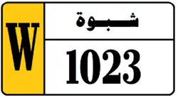 Starting from February 2020, Shabwah Governorate joined with Hadhramaut Governorate in issuing license plates in this new format and appearance. Similar to Hadhramaut, Shabwah License Plates consist of black text and black boundary on white background. Shabwah Governorate plates consist of the governorate name in Arabic (شبوة) and a 4 digit number. Shabwah Governorate plates also have a strip on the left hand side with the letter W in black on a background whose color depends on the classification of the vehicle. Temporary plates have a strip on the right hand side that says "مؤقت", meaning temporary, on a blue background. The license plates for Shabwah use a unique serif font.[7]