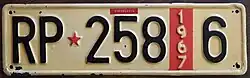 • Temporary plates had RP (registrovano privremeno) on the place of the district code, followed by three or four digits, a vertical red band containing the year of registration and a numerical denotation of the republic where the vehicle was temporarily registered.