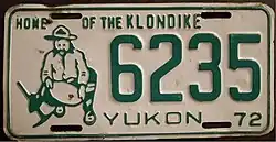 1972 | Green on white with border line; green embossed prospector at left with gold paint speck; "YUKON 72" at bottom | Home of the Klondike | 1234 | 1 to approximately 6500 | |
