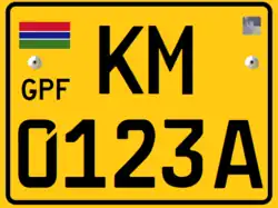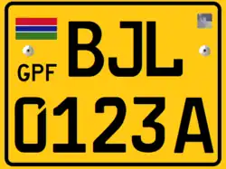 Registration plates of the Gambia have, since 2019 have been coloured yellow or white with black lettering. To the left is the Gambia flag and the letters "GPF". The plates are in the standard European size, and feature the German FE font. The first set of letters denote the city of issue, such as BJL for Banjul.