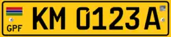 52 cm x 11 cm Black on yellow Gambian Flag as well as the text GPF on the top left corner of the license plate |