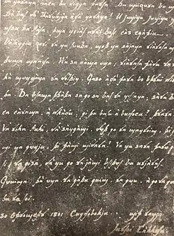 Vilara's letter signed by him as "30 Oktomvrit 1801 Vagopolja, mik tëndë Jatroi Vellara" (October 30, 1801, Vokopolja, your friend Doctor Vellara), shows that the alphabet was known and used by other people at that time.