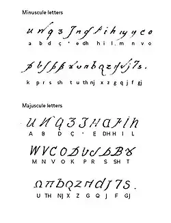 Vellara script or Vellara alphabet is one of the original Albanian alphabets, encountered for the first time in the early 19th century. It is named after the Greek doctor, lyricist and writer Ioannis Vilaras (Jan Vellarai in Albanian),[2] the author of a manuscript where this alphabet is documented for the first and so far the only time.[3][4]