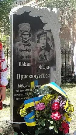 Memorial to Nestor Makhno and Fedir Shchus commemorating the 100th anniversary of the Battle of Dibrivka