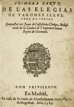 Literature written in Venezuelan territory began to develop at the time of the Conquest of America with the Chronicles of the Indies and later with the first autograph texts by colonial authors. Literary activity was constant throughout the colonial period, but due to the late introduction of the printing press in the region, few works have survived to the present day. Between 1563 and 1564, Pedro de la Cadena wrote his epic poem Los actos y hazañas valerosas del capitán Diego Hernández de Serpa, which is the first written work of literature with a Venezuelan theme and possibly the earliest poem written in the Americas in a European language.[1][2][3] De la Cadena and other Spanish authors who set the action of their poems on Cubagua island, like Juan de Castellanos (author of the Elegías de varones ilustres de Indias) or Jorge de Herrera, were known at the time as the "poets of Cubagua".