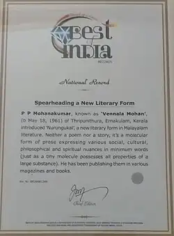- 2020 - Spearheading a New Literary Form - Vennala Mohan features in Best-of-India Records (BIR) [3][4]