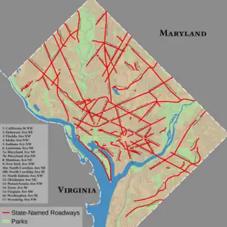 As the capital of the United States, Washington, D.C. has 51 roadways which are named after each state and the territory of Puerto Rico. Many of these roadways are major avenues that serve as the city's principal traffic arteries. Every state-named roadway is an avenue except for California Street and Ohio Drive.