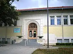 The Vermont Square Branch was designated as a Historic-Cultural Monument (#264) by the Los Angeles Cultural Heritage Commission in June 1983 as the oldest remaining library in the city system.[1][3] In 1987, the Lincoln Heights Branch and several other branch libraries in Los Angeles were added to the National Register of Historic Places as part of a thematic group submission.[4] The application noted that the branch libraries had been constructed in a variety of period revival styles to house the initial branch library system of the City of Los Angeles. With respect to the Vermont Branch, the application described the building as "a one-story structure designed in the Italian Renaissance Revival and Mediterranean Revival style with Prairie style proportions."[4] It rests on a raised foundation and is topped by a red tile roof supported by broad overhanging eaves. The symmetrical facade is divided into three sections with the center portion protruding slightly. The center portion is fronted with terra cotta blocks with geometric patterns reminiscent of Classical motifs. The entry is located on a landing midway up the stairs. The top half of the staircase is located inside the building. Both wings are horizontally divided with two different facing materials. Cream-colored glazed brick covers the exterior walls below the window sills. Long vertical windows are arranged high on the walls, grouped in bands of five on either side of the entry.[4]