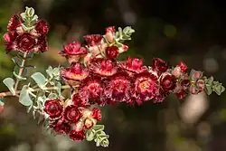 The flowers are arranged in spikes along the branches, opening in sequence from the lowest flowers, each flower on a stalk about 1 mm (0.04 in) long. The floral cup is top-shaped, 3.5 mm (0.1 in) long, glabrous and slightly rough with green appendages about 1 mm (0.04 in) long. The sepals are a deep maroon colour, spreading, 4–5 mm (0.16–0.20 in) long and have 8 or 9 feathery lobes and two large, hairy, ear-like appendages. The petals are a similar colour, erect, 5 mm (0.2 in) long, 3.5 mm (0.1 in) wide with a fringe a further 2 mm (0.08 in) and also have small, hairy, ear-like appendages. The style is 7 mm (0.3 in) long, curved, and densely hairy near the tip. Flowering time is from September to January.[2]