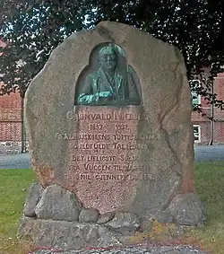 In front of the school's buildings and facing Vestbirkvej, a memorial stone has been erected with a bronze relief portrait of Grønvald Nielsen. The artist Hansen Jacobsen has depicted Grønvald Nielsen standing with one arm resting on a pulpit and a gentle and smiling face. It gives the impression that he was an avid speaker and discusser who had a friendly and welcoming demeanor . The memorial stone was unveiled in 1932 and cost 2,500 Danish krones. The inscription reads:[1][9]