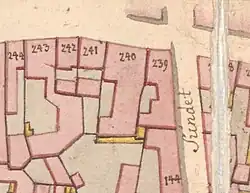 The site was part of two separate properties in the late 17th century. In Copenhagen's first cadastre of 1689 they were listed as No. 225 and No. 226. They were owned at that time by grocer (høker) Mikkel Jostsen (No. 225) and cooper Jacob Pedersen (No. 226). The properties were later merged into a single property. In the new cadastre of 1756, it was listed as No. 239. The owner at that time was tobacco spinner Niels Christensen Tromp.[1]