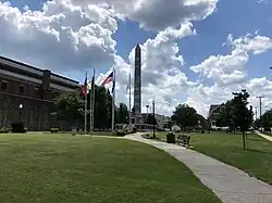 Veterans Park of Cambria County memorializes the approximately 5,500 soldiers from Cambria County, Pennsylvania who fought in the Revolutionary War, War of 1812, Mexican-American War, Civil War and Spanish-American War and is located in Ebensburg, Pennsylvania. The main feature of the park is a 63-foot (19.2 m) tall grey granite monument, which consists of an obelisk and towards the base facing east is a bronze Civil War "armed sentinel" manufactured by the Gorham Co. Foundry.[1] Around the monument are 22 plaques listing the 5,500 names of the soldiers.[2] However, this list of soldiers is not to be considered completely accurate. There were Cambria County soldiers that were not listed on this memorial due to one or more reasons. These reasons include: the entire family may have moved out of Cambria County before the memorial was built, or, the soldier may have joined a unit that was formed in another county.[2] A plaque just below the Armed Sentinel reads: "[e]rected to the memory of the soldiers and sailors from Cambria County, Pennsylvania who fought in defense of their country."[3]