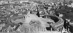 Plans were drawn up several times over the years for the construction of a major link between the Vatican City and the centre of Rome; the number of submissions increasing dramatically with the onset of the Italian Renaissance. The first design was submitted by Leone Battista Alberti during the reign of Pope Nicholas V,[6] and formed one of the two perennial designs proposed for the area. Alberti envisioned an "open" plan, consisting of a single voluminous V-shaped boulevard, widest at St. Peter's Basilica itself and tapering as it approached the Tiber. The other scheme of designs submitted by architects was a "closed" plan that would consist of two roads arching outwards in an ellipse, with the Tiber and the Square at opposite ends. Proponents of a closed plan would usually suggest that the space between the two causeways be separated by a colonnade, or by a row of inhabited structures whose designs would be scrutinised and approved by architects employed by the Holy See. Variations on both themes were submitted time and time again. Proponents of an "open" plan included such architects as Giovanni Battista Nolli and Cosimo Morelli.[7][8] A number of other architects, such as Carlo Fontana, and at least one Pope (Sixtus V) favoured a "closed" design, with a number of streets radiating from the central square, maintaining the "spina", or spine, of the structures of Borgo directly between the square and the Tiber.[9] Neither approach moved beyond sketches and blueprints. Both open and closed designs were considered by the Vatican, but were ultimately discarded for reasons of expense. A thorough examination of the costs of constructing a thoroughfare was made by the Vatican-approved St. Peter's Building Commission in 1651. Their conclusion was that "the cardinals' proposal to demolish all the buildings between the Borgo Nuovo and the Borgo Vecchio for a greater and longer vista to the church" would be infeasible due to inordinately high expropriation costs and vested property interests.[7]