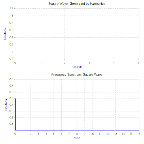 In the case of our square wave force, the first component is actually a constant force of 0.5 newton and is represented by a value at 0 Hz in the frequency spectrum. The next component is a 1 Hz sine wave with an amplitude of 0.64. This is shown by the line at 1 Hz. The remaining components are at odd frequencies and it takes an infinite amount of sine waves to generate the perfect square wave. Hence, the Fourier transform allows you to interpret the force as a sum of sinusoidal forces being applied instead of a more "complex" force (e.g. a square wave).