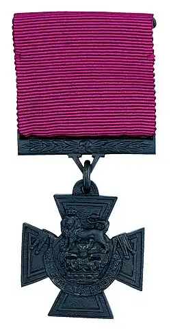 The Victoria Cross for New Zealand is identical to the original design.[7] The decoration is a cross pattée, having straight edges and approximately 36 millimetres (1.4 in) square, bearing a crown surmounted by a lion, and the inscription "For Valour". The cross is suspended by a ring from a seriffed "V" to a bar ornamented with laurel leaves, through which the ribbon passes. The reverse of the suspension bar is engraved with the recipient's name, rank, number and unit. On the reverse of the medal is a circular panel on which the date of the act for which it was awarded is engraved in the centre. The ribbon is crimson, 38 millimetres (1.5 in) wide.[9][10]