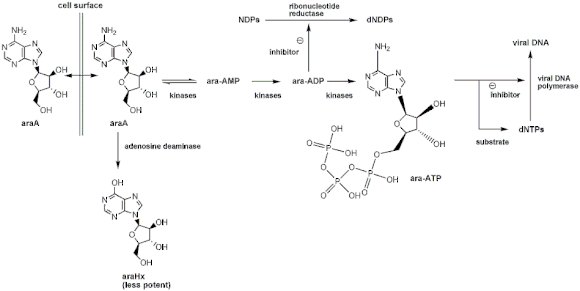 Vidarabine works by interfering with the synthesis of viral DNA.[4] It is a nucleoside analog and therefore has to be phosphorylated to be active. This is a three-step process in which vidarabine is sequentially phosphorylated by kinases to the triphosphate ara-ATP. This is the active form of vidarabine and is both an inhibitor and a substrate of viral DNA polymerase.[5]